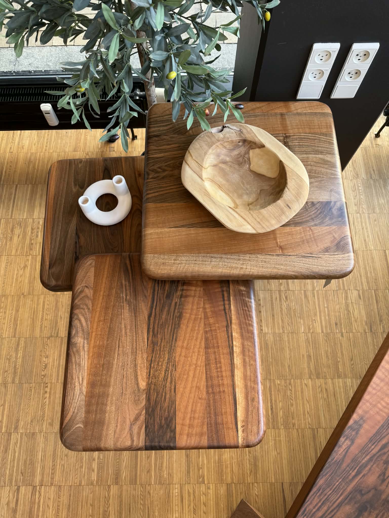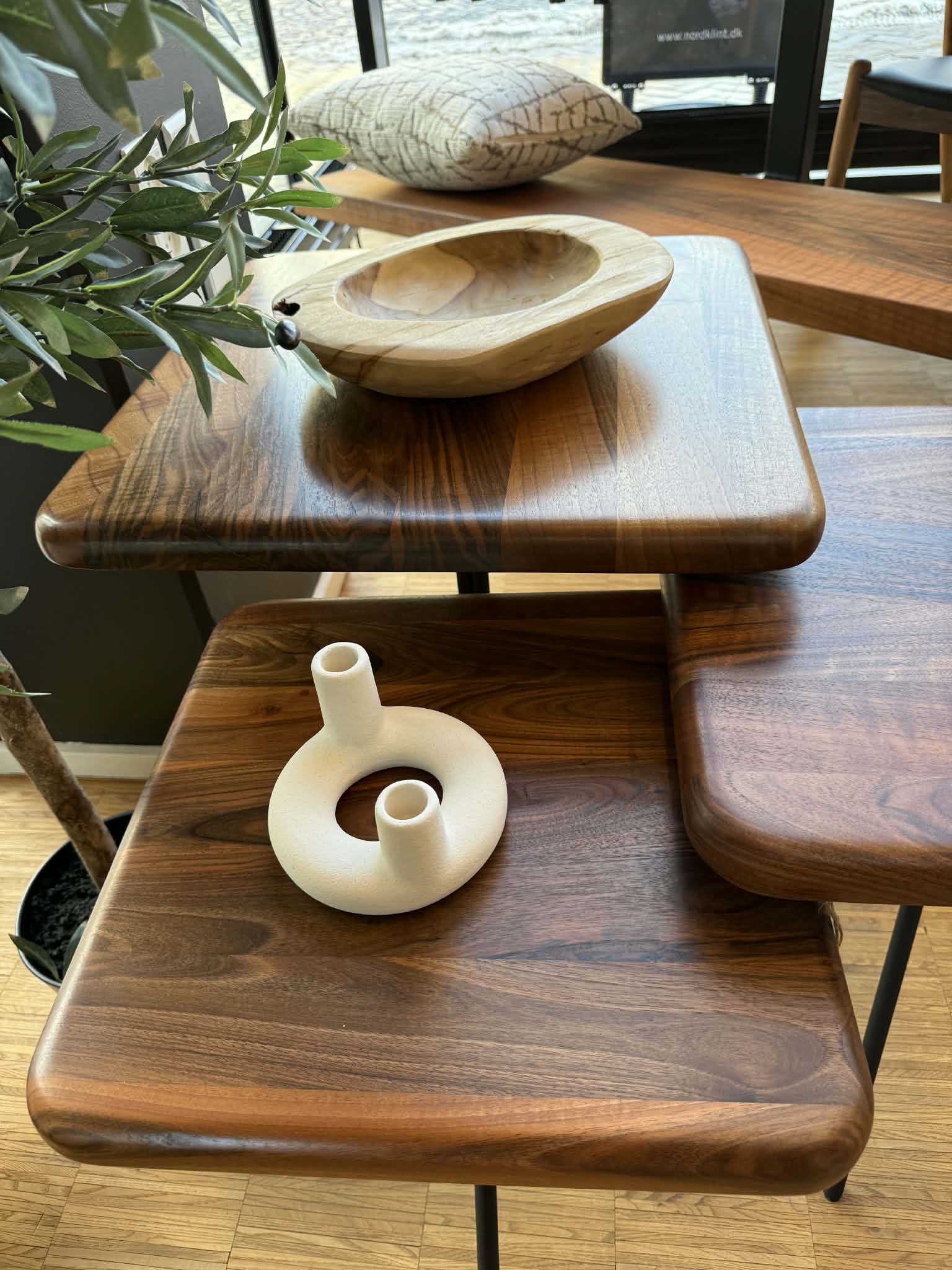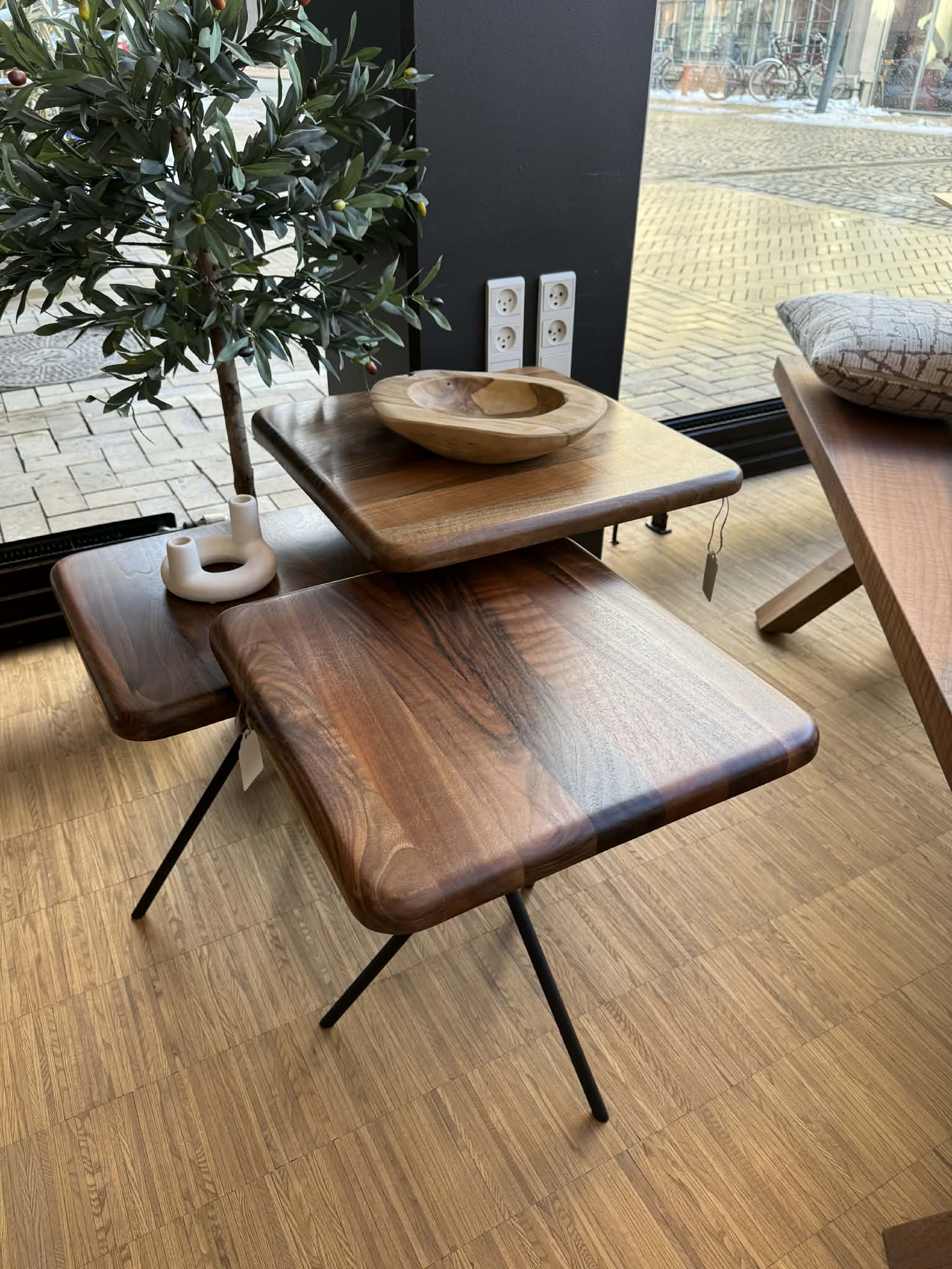 Disse tre sideborde er en del af Butikkens møbler og findes kun i dette ene sæt. Bordene er fremstillet i massivt valnød med markante åretegninger og naturlige kontraster i træets farvespil.