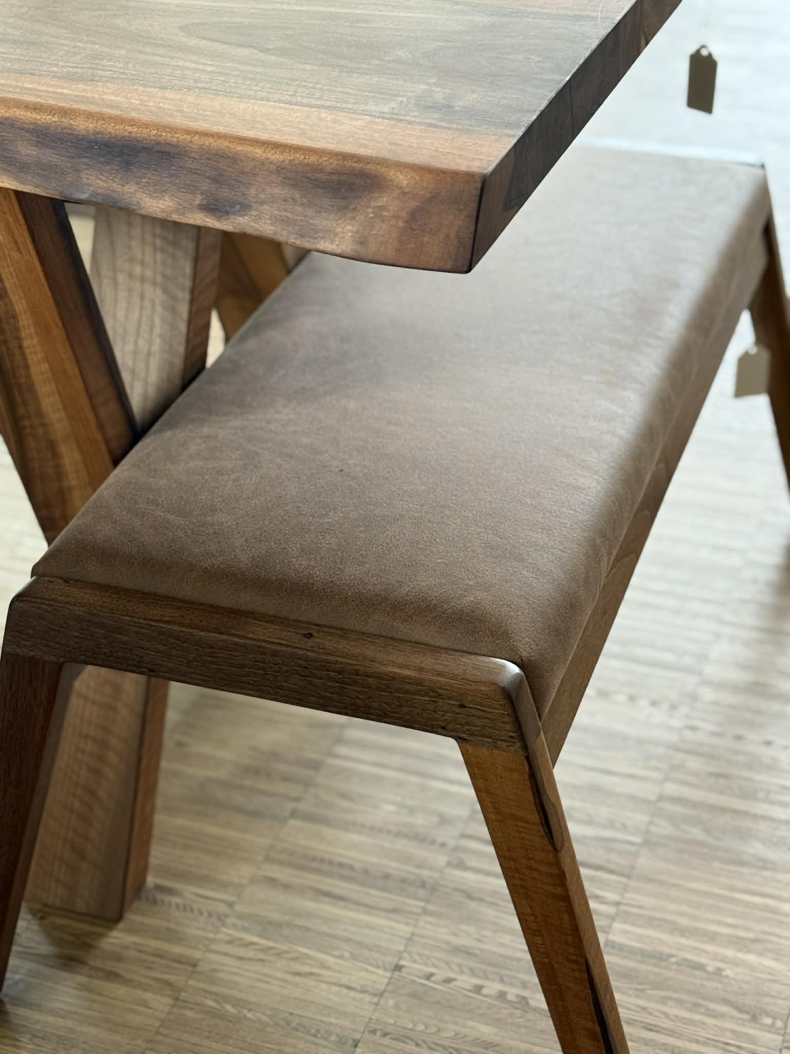 De slanke, let skrå ben giver bænken et let og moderne udtryk, mens den massive ramme sikrer stabilitet. Kombinationen af massiv valnød og PU-læder skaber et tidløst møbel med karakter.