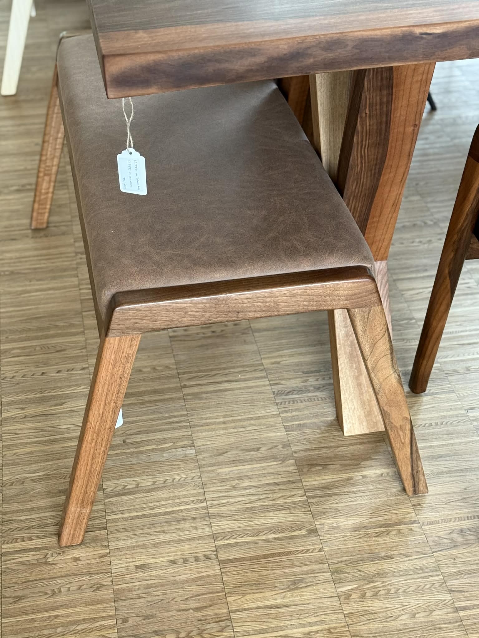 Denne bænk er en del af Butikkens møbler og produceres ikke igen i samme sammensætning. Hvert stykke valnød har sit eget unikke spil, hvilket gør netop denne bænk helt særlig.