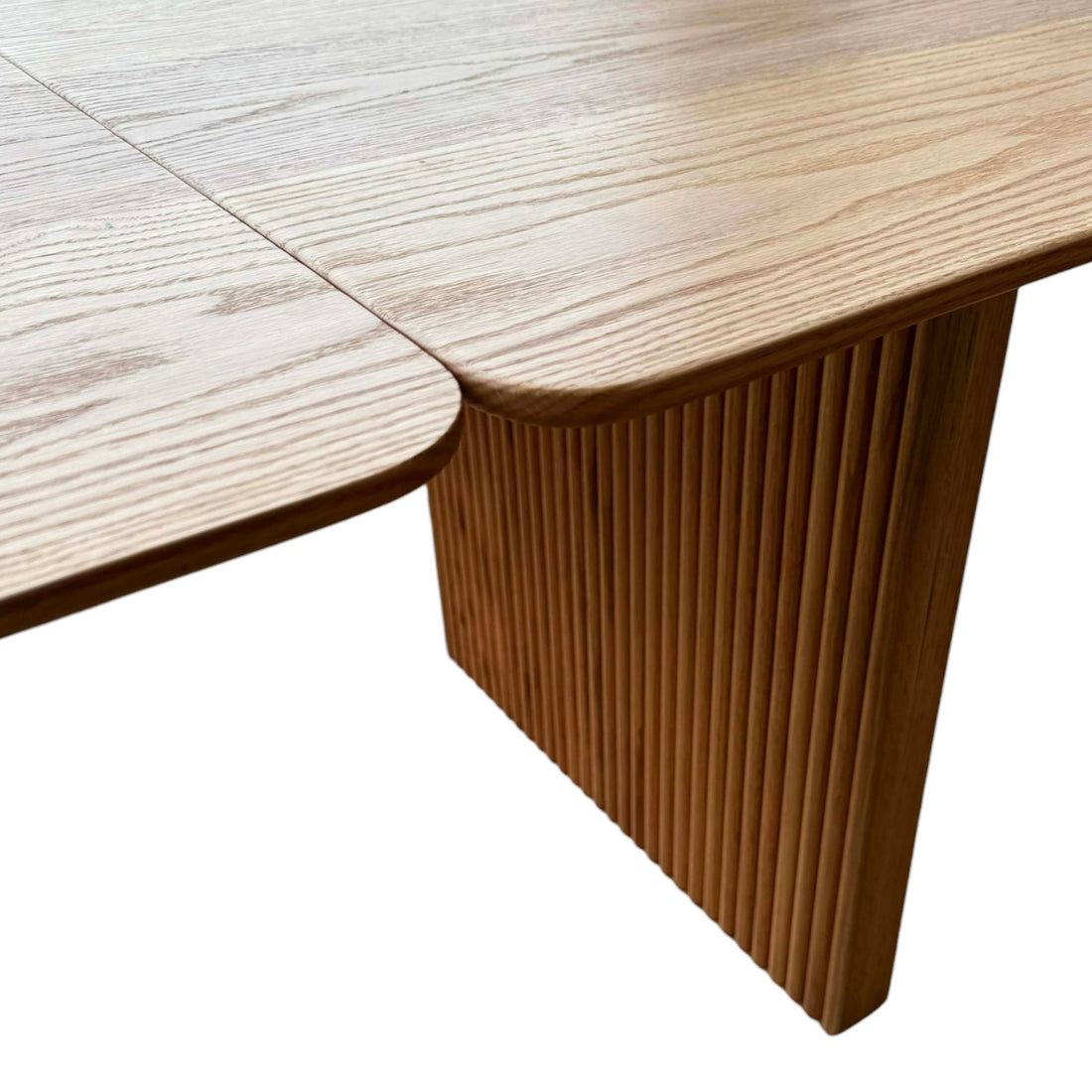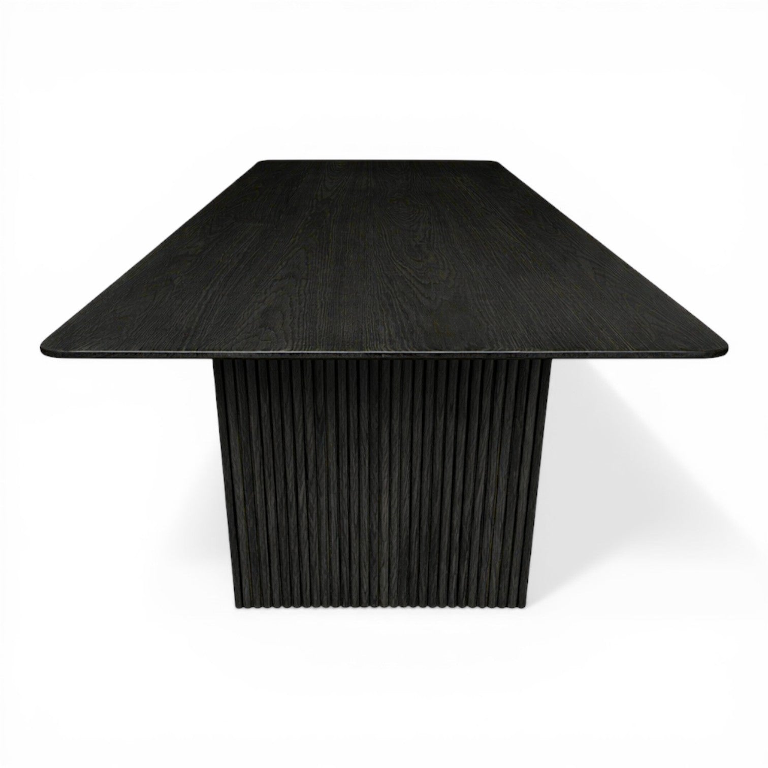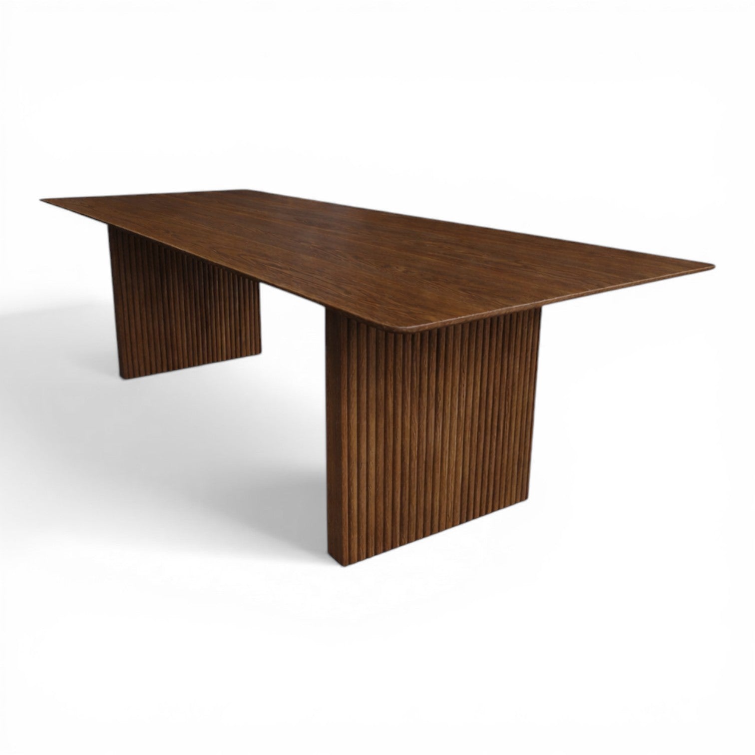 De to sokler er opbygget i massivt træ med præcist udførte rillede lameller, som giver bordet sit karakteristiske udtryk. Hver detalje er udført med fokus på symmetri, balance og finish.