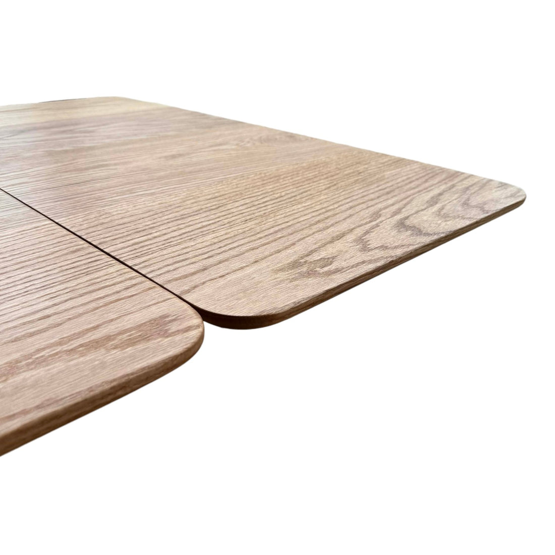 Tillægspladerne er udført i massivt træ fra samme planke som bordet, hvor åretegninger og struktur er nøje afstemt, så helheden fremstår fuldstændig harmonisk og gennemført.