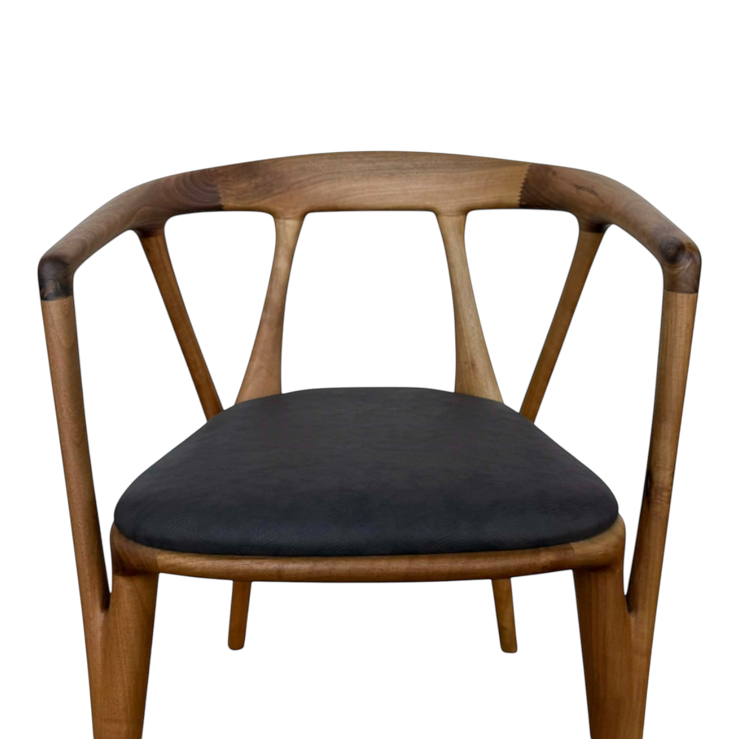 Nordisk Y i valnød bringer en mere jordnær stemning ind i rummet. De varme trætoner, den solide konstruktion og det bløde sæde skaber en afbalanceret kontrast mellem styrke og komfort – en stol, der giver rummet karakter uden at tage opmærksomheden.