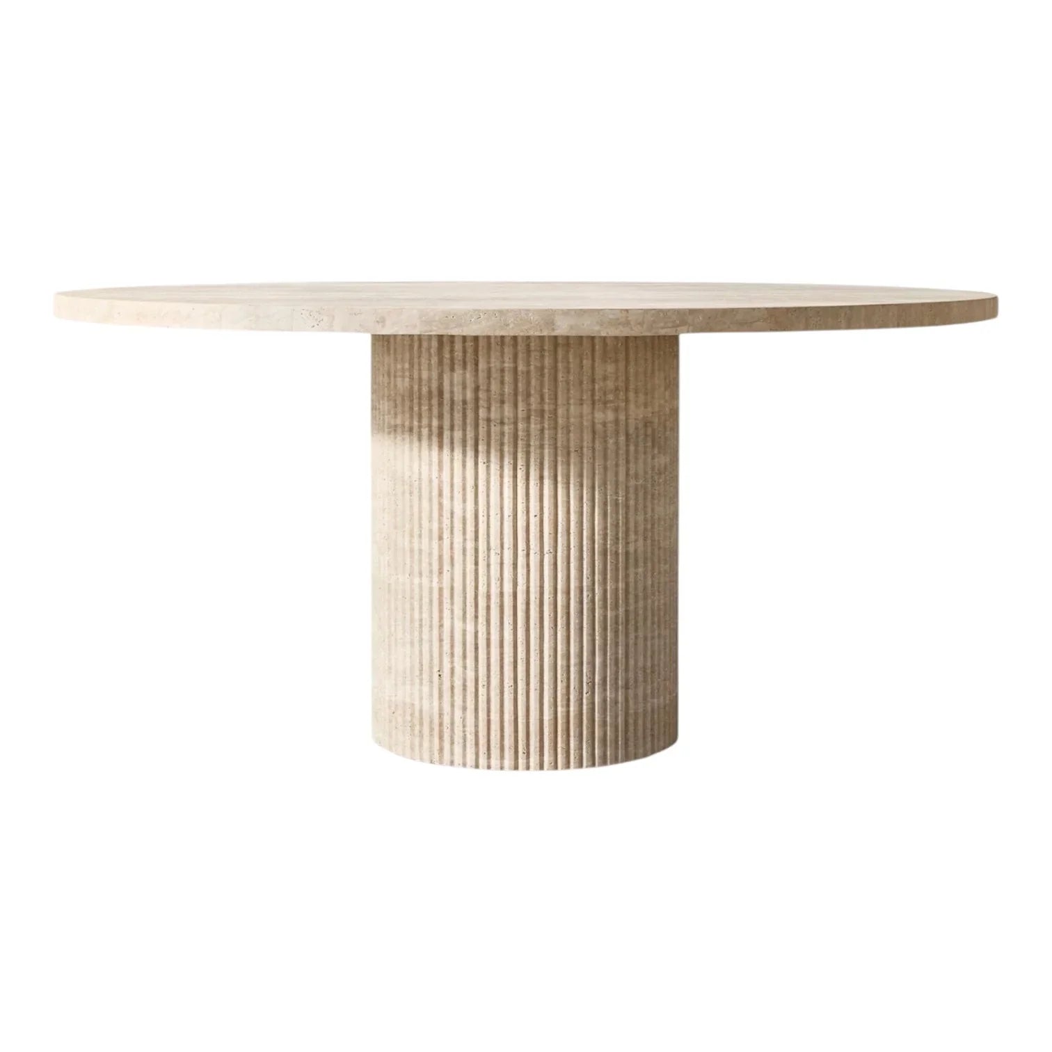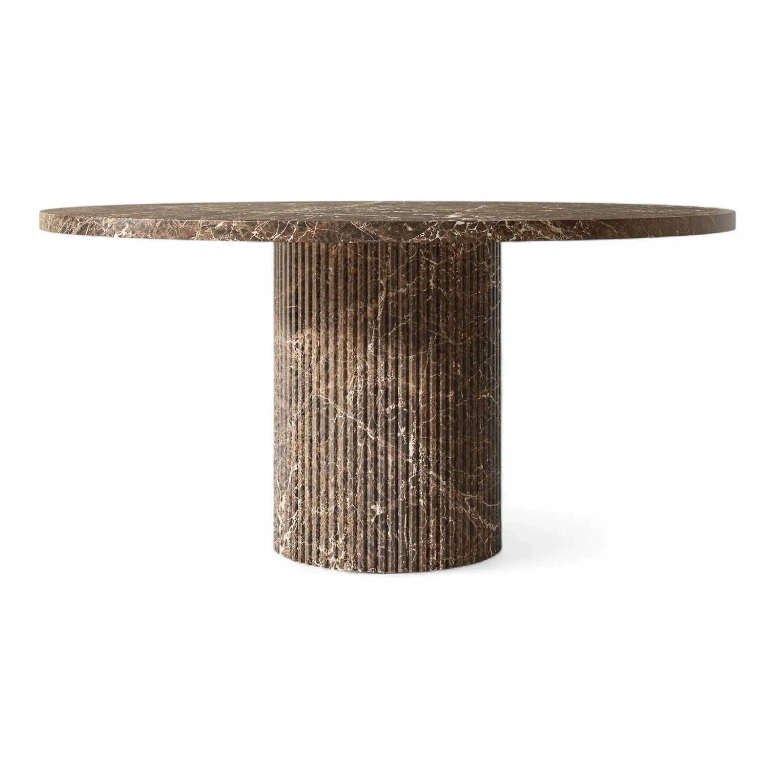 Den runde bordplade bæres af den massive cylindriske stonesokkel, hvor naturstenens lag, struktur og dybde skaber et levende, harmonisk formsprog.