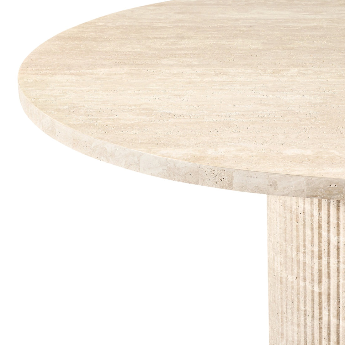 Nova Sten er fremstillet i massiv natursten (travertin eller marmor) med 3 cm tyk rund bordplade og massiv cylindrisk stonesokkel i samme materiale.