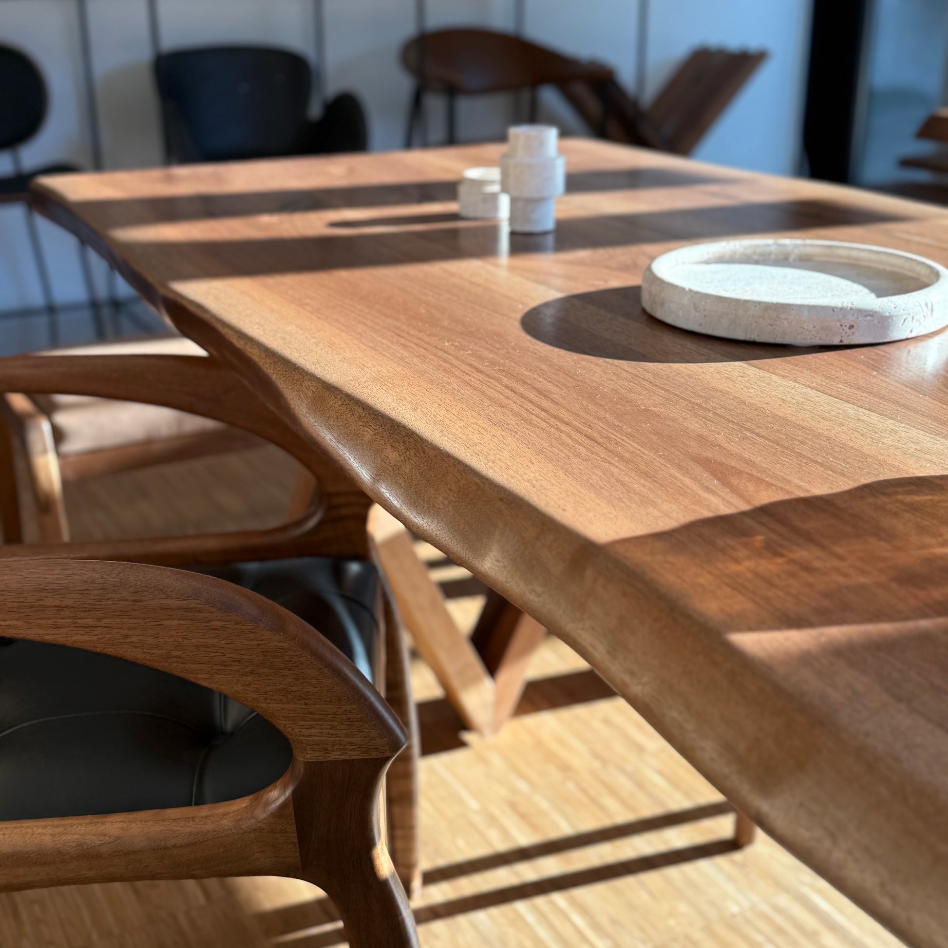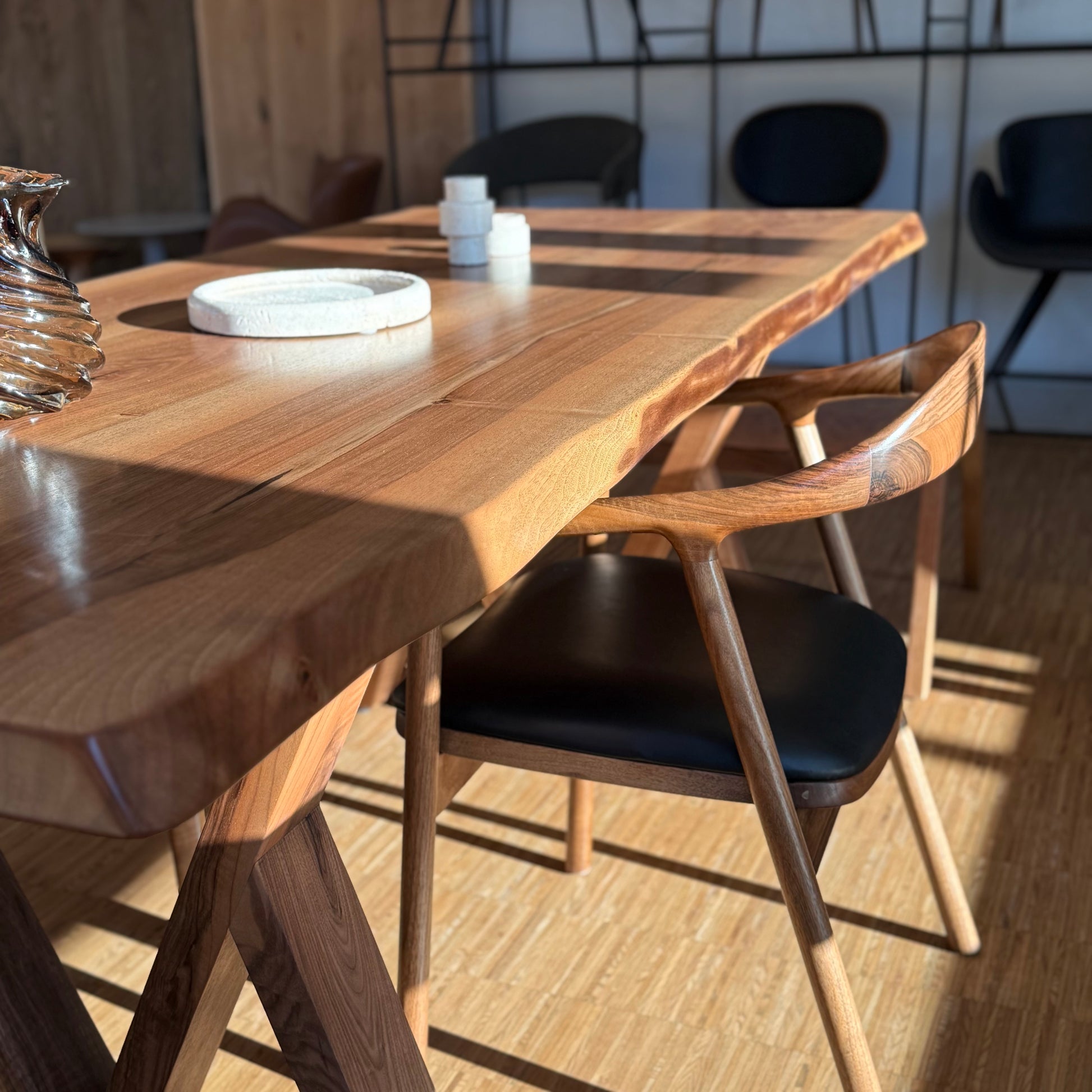Plankerne er nøje udvalgt og sammensat for at skabe et harmonisk forløb i træets struktur. Den organiske kant understreger træets naturlige form og giver bordet et levende og eksklusivt udtryk.