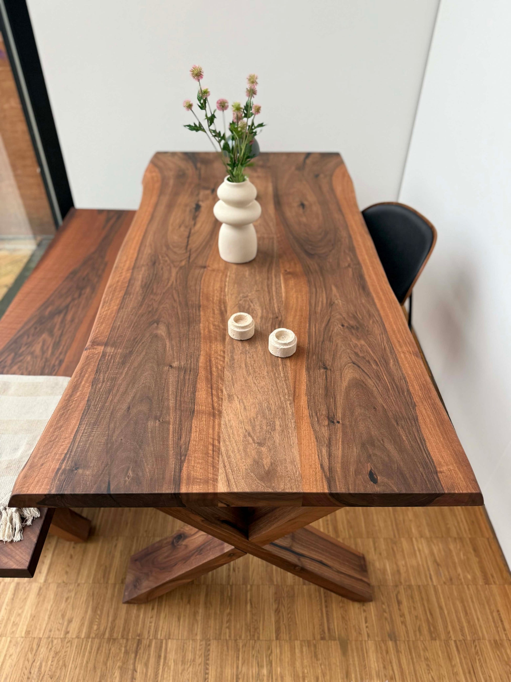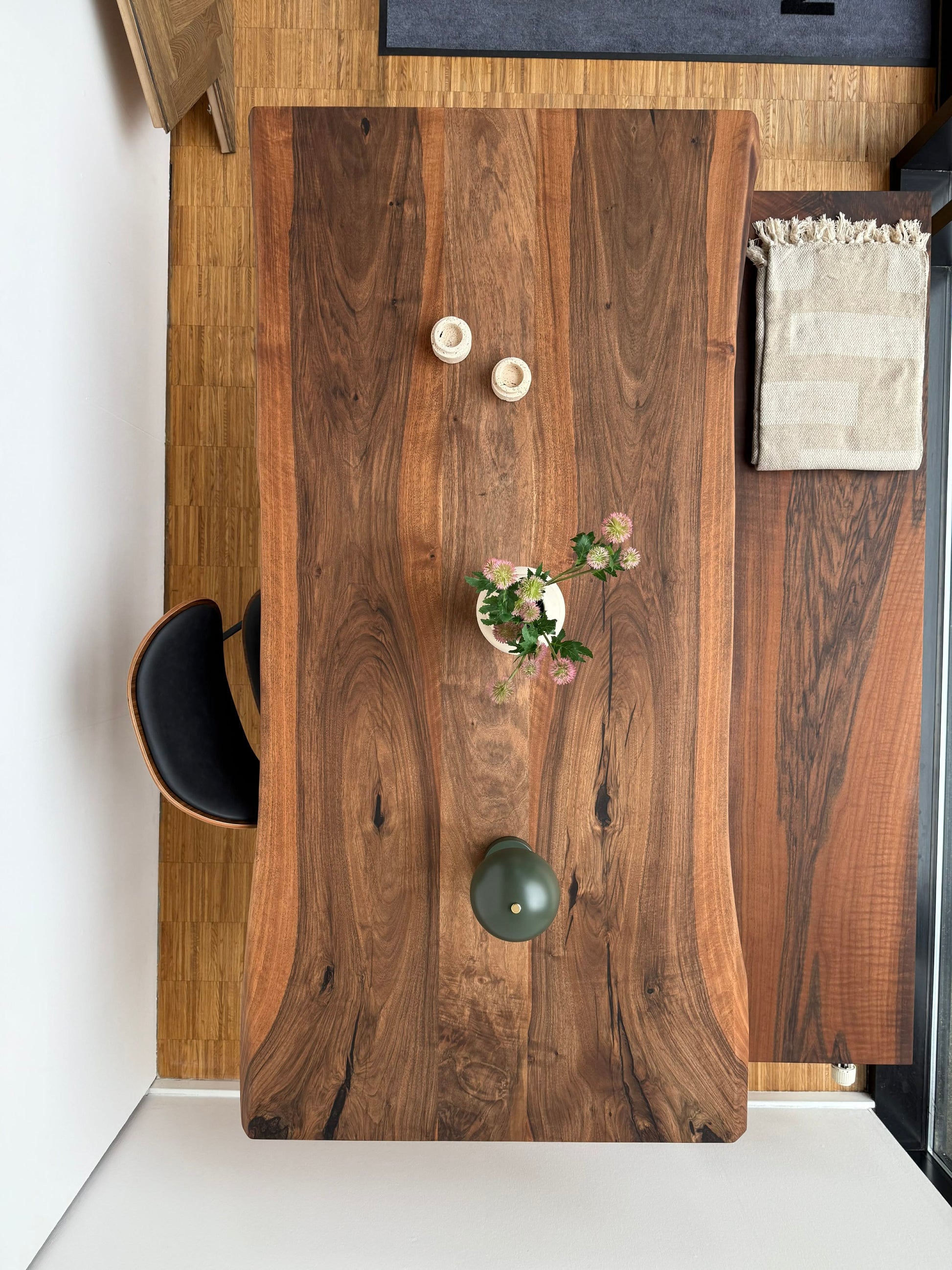 Bordet er behandlet med Rubio Monocoat, som fremhæver valnøddens varme toner og naturlige struktur. Overfladen fremstår mat og slidstærk med en silkeblød finish.