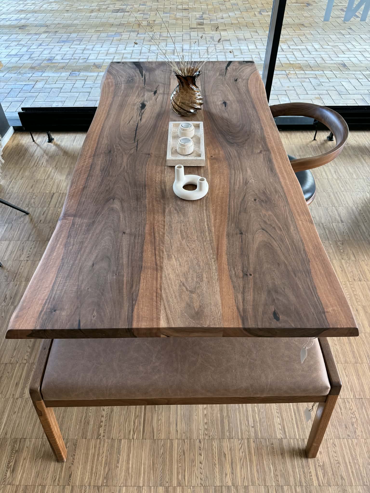 Dette plankebord er en del af Butikkens møbler og findes kun i dette ene eksemplar. Bordet er fremstillet i massivt valnød med brede planker, hvor åretegninger og naturlige nuancer skaber et markant og levende udtryk.