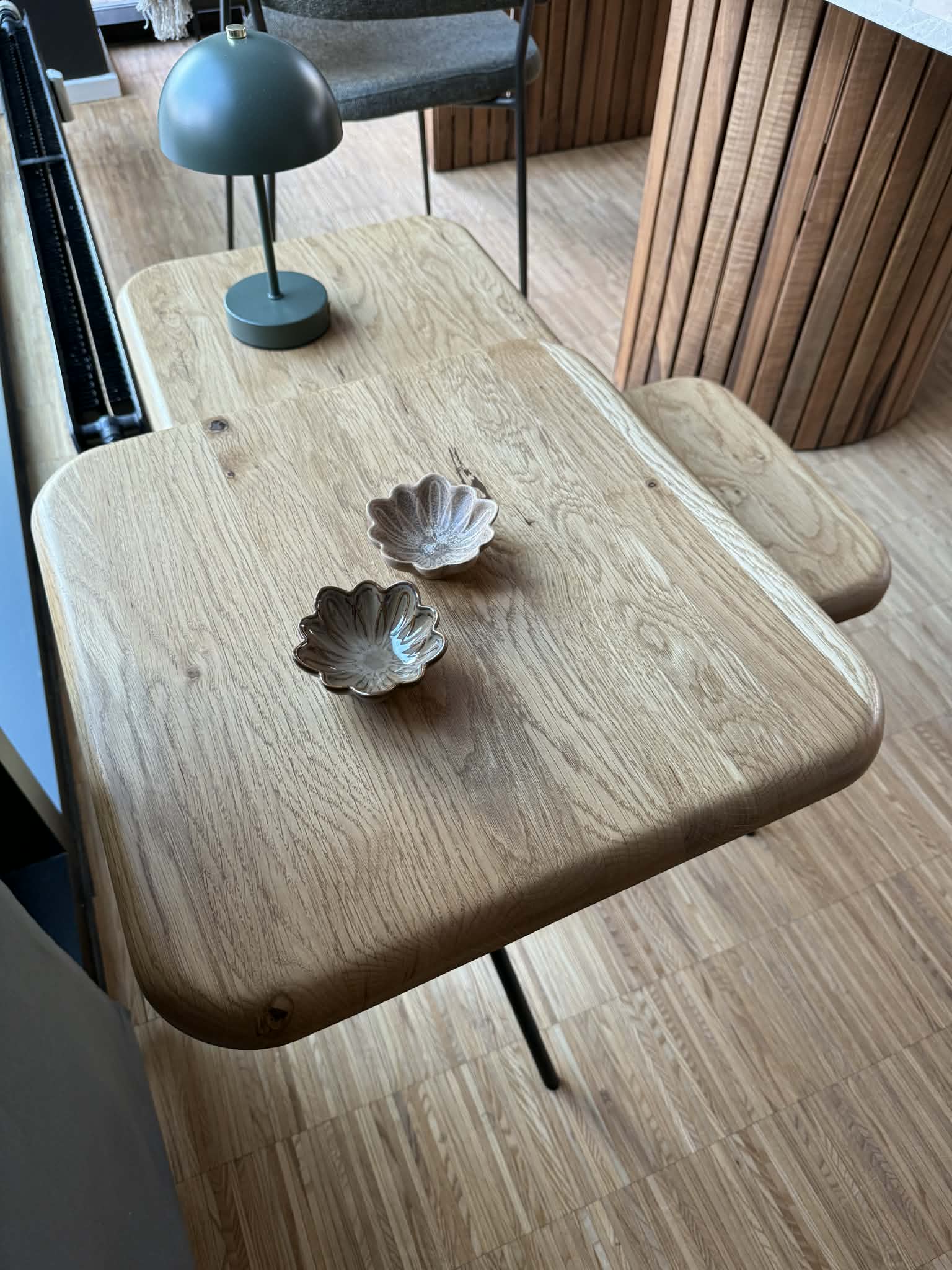 De afrundede kanter og den bløde profil giver bordpladerne et harmonisk og organisk udtryk, hvor træets struktur får lov at træde tydeligt frem.
