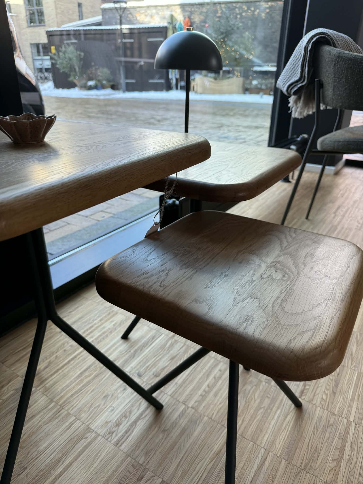 Dette sæt er en del af Butikkens møbler og produceres ikke igen i samme sammensætning. Træets struktur og nuancer kan ikke genskabes identisk.