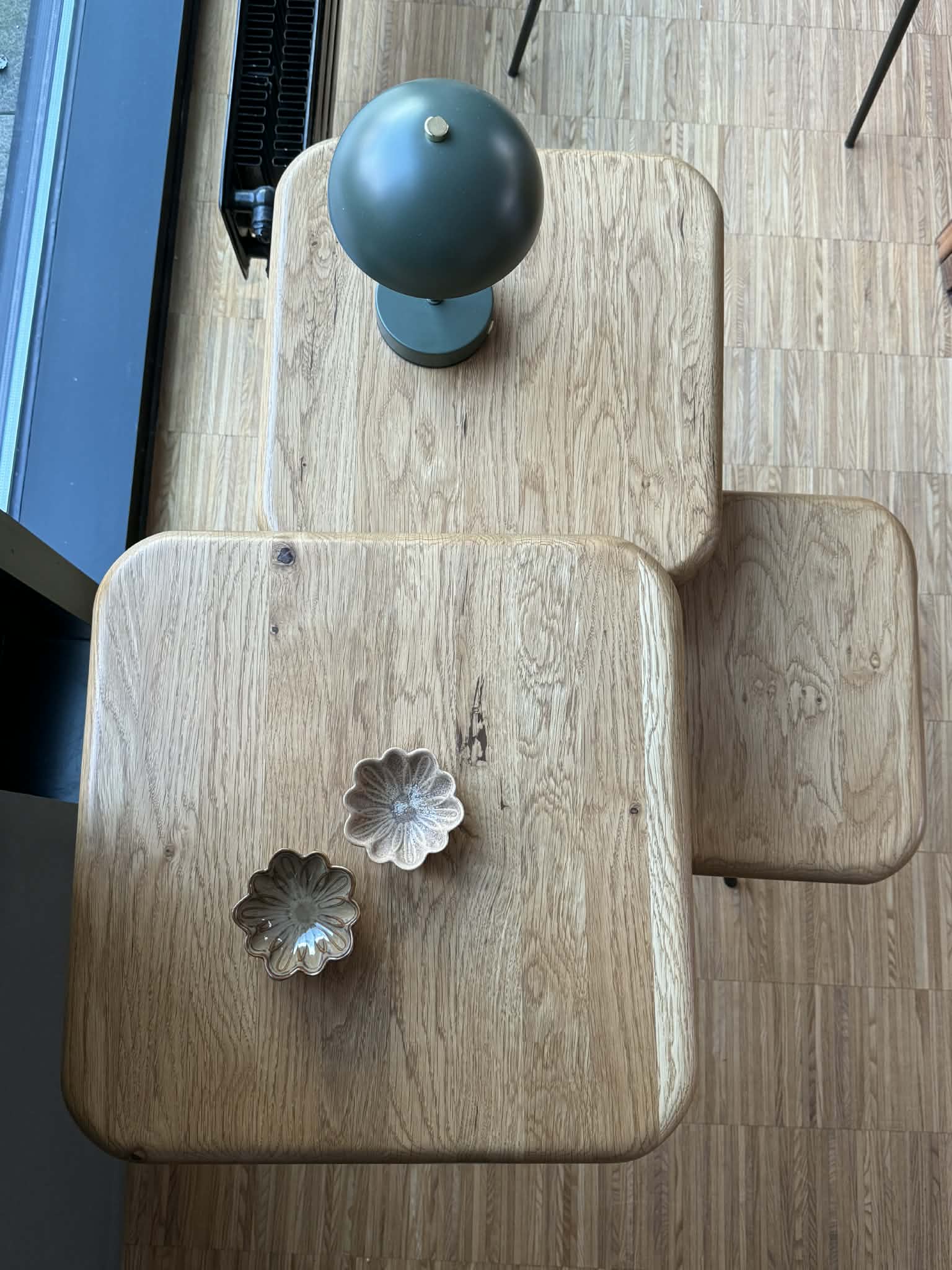 Disse tre borde er en del af Butikkens møbler og findes kun i dette ene sæt. Bordene er fremstillet i massivt eg med synlige åretegninger og et naturligt, roligt farvespil.