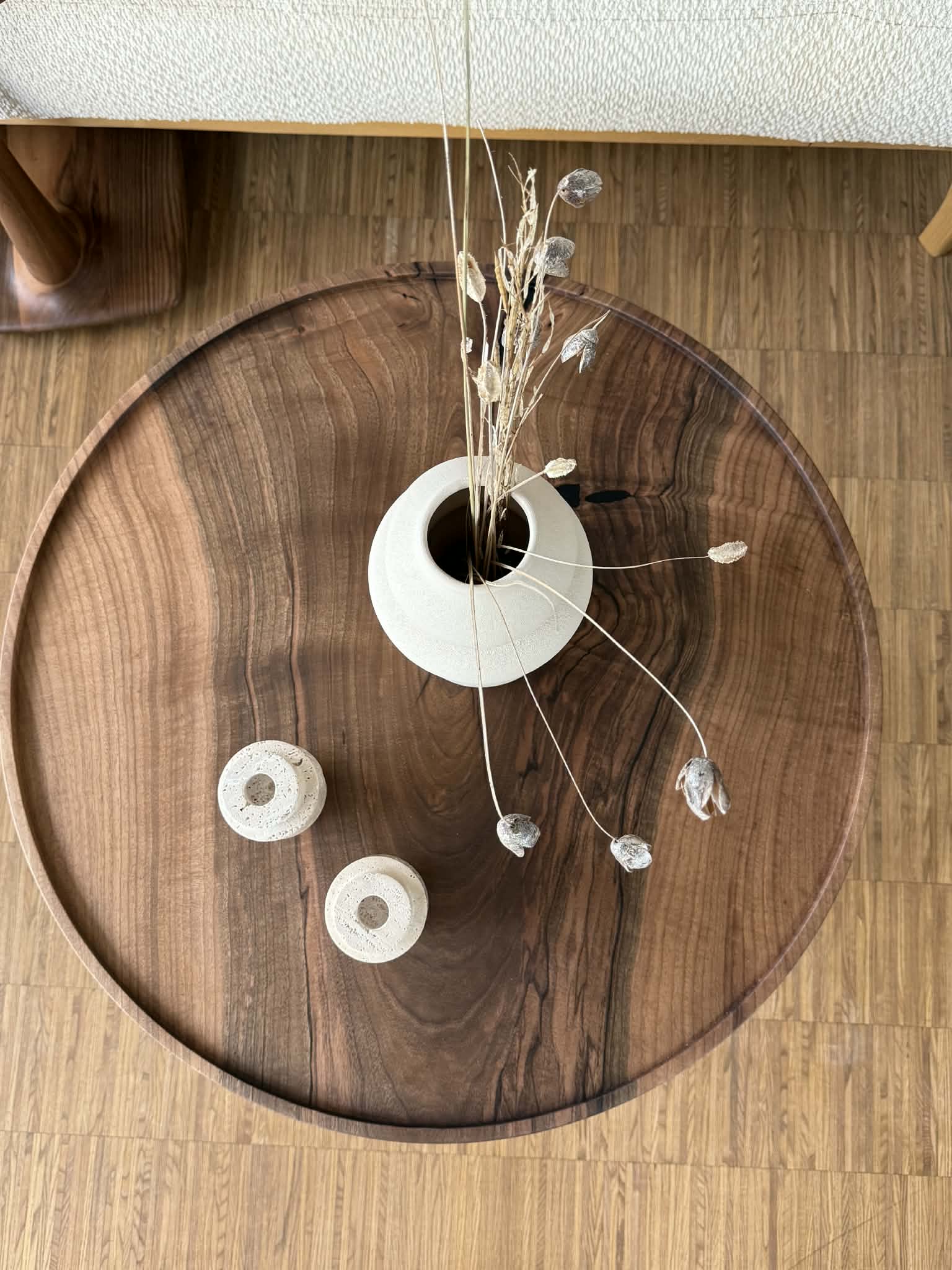 Dette sofabord i massiv valnød måler 70 cm i diameter og er skabt som et harmonisk samlingspunkt i stuen. Den runde form bløder indretningen op og skaber balance, mens valnøddens levende åretegninger giver dybde og karakter.