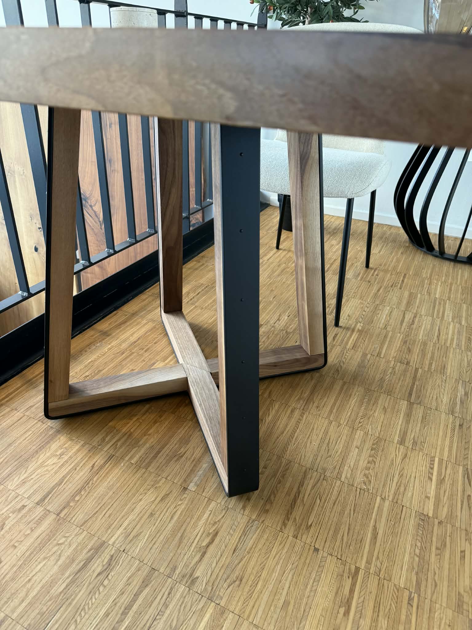 Bordet kan leveres med forskellige stel-løsninger, herunder kombinationer af massiv valnød og metal, som skaber kontrast og visuel lethed under den massive plade.