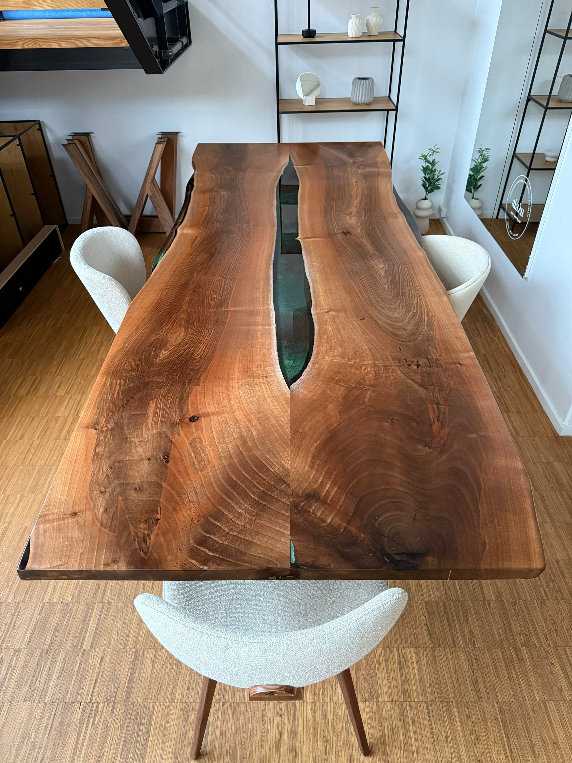 Træets struktur bevæger sig organisk gennem hele længden, og kontrasten mellem den varme valnød og den dybe grønne epoxy giver bordet karakter og eksklusivitet.