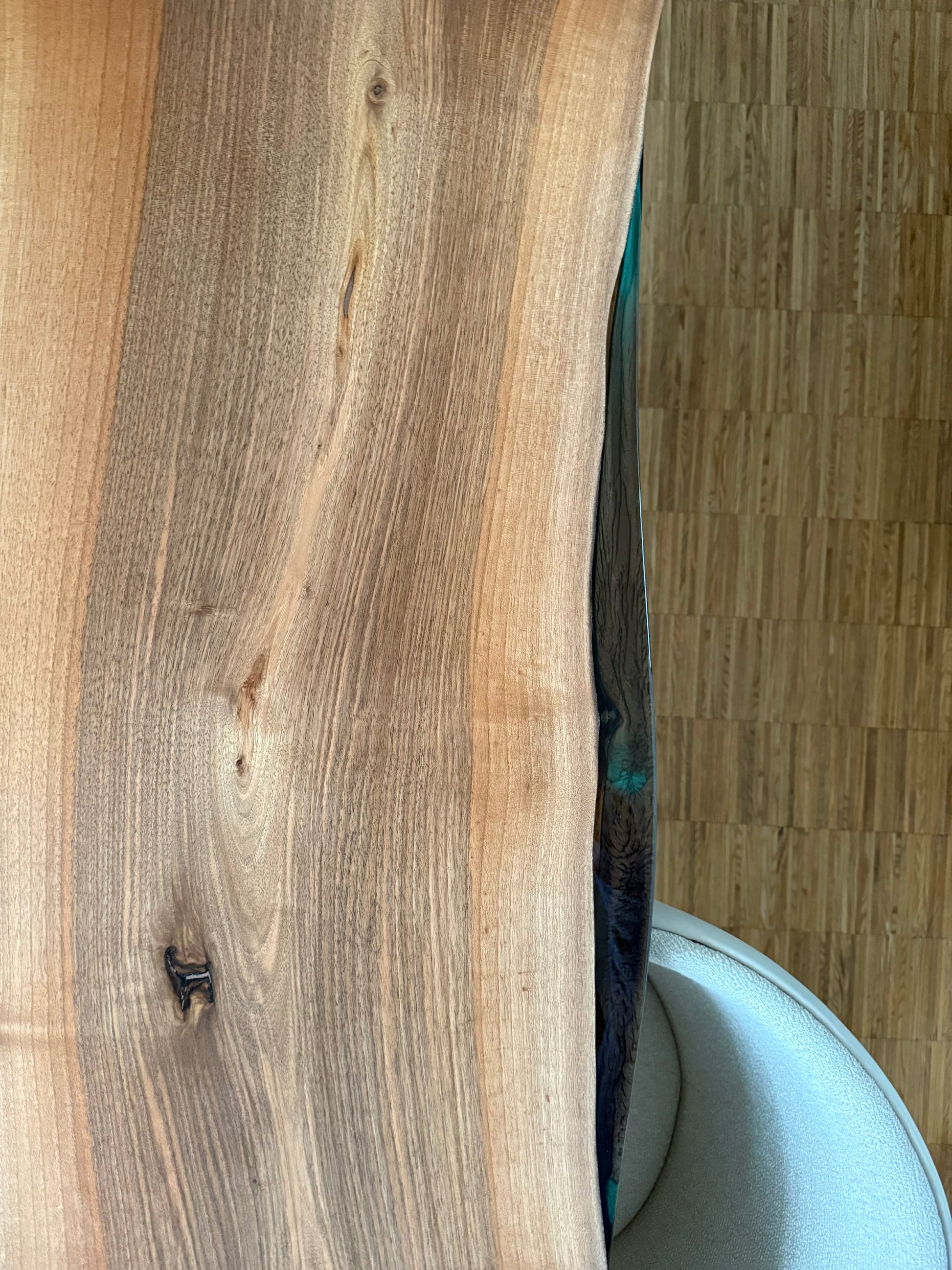Epoxy-floden følger træets naturlige åbning og er støbt, så den fremstår integreret og harmonisk. Hver detalje i strukturen er bevaret for at fremhæve det rå og autentiske udtryk – kombineret med en elegant og eksklusiv finish.