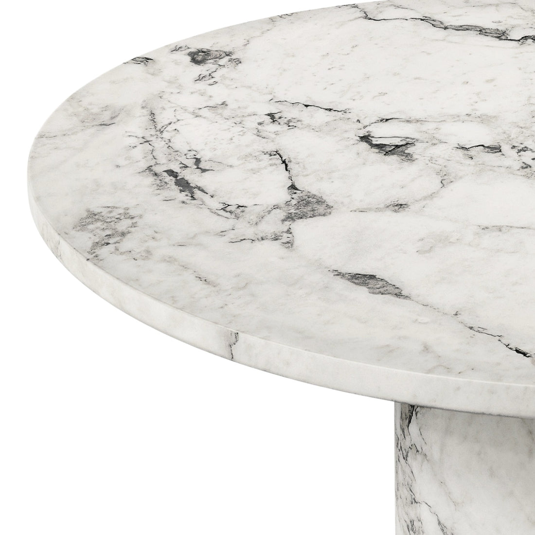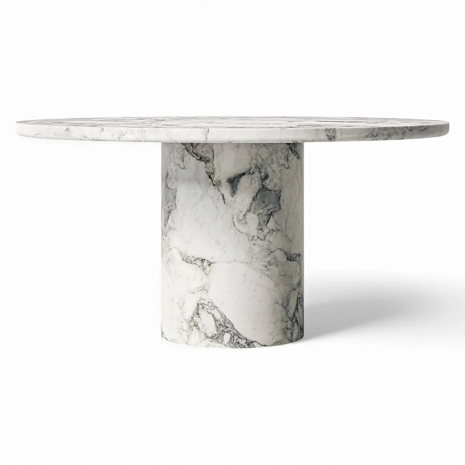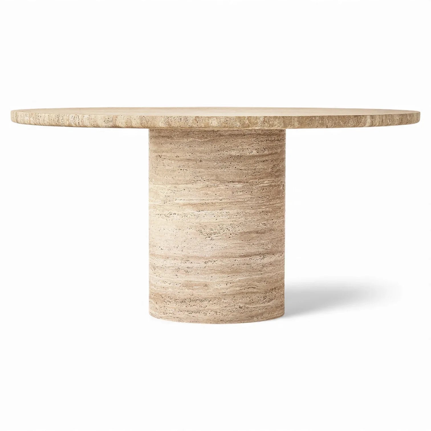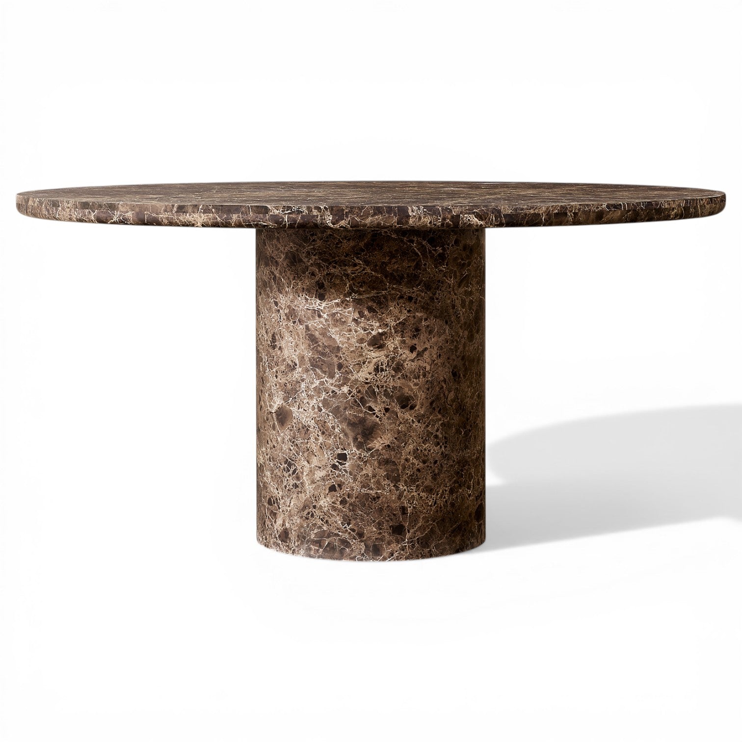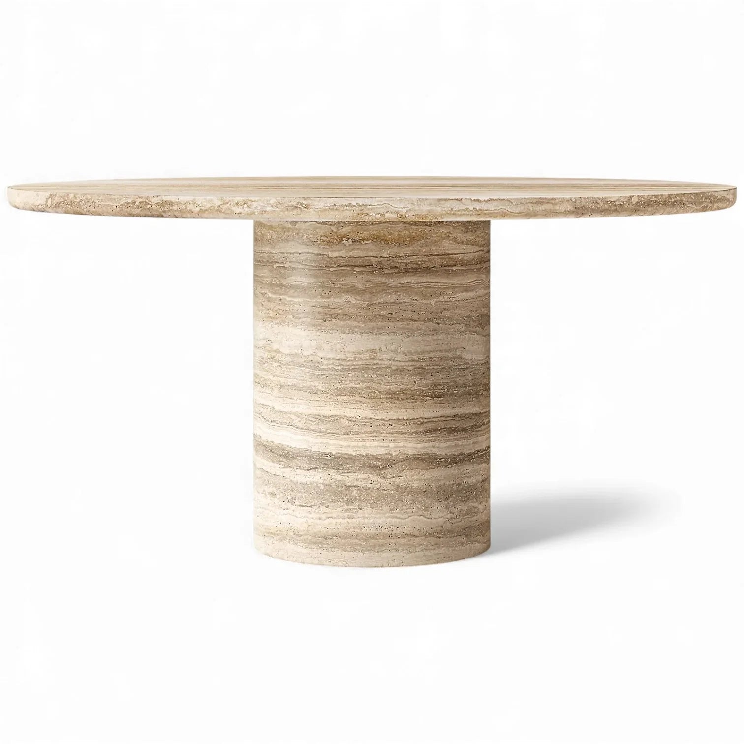 Fås i flere eksklusive varianter – fra lys Tiziano til mørk Brun Travertin – hver med sit eget særpræg og udtryk. Den massive cylinderformede base understøtter bordpladen med en naturlig styrke og skulpturel tilstedeværelse.